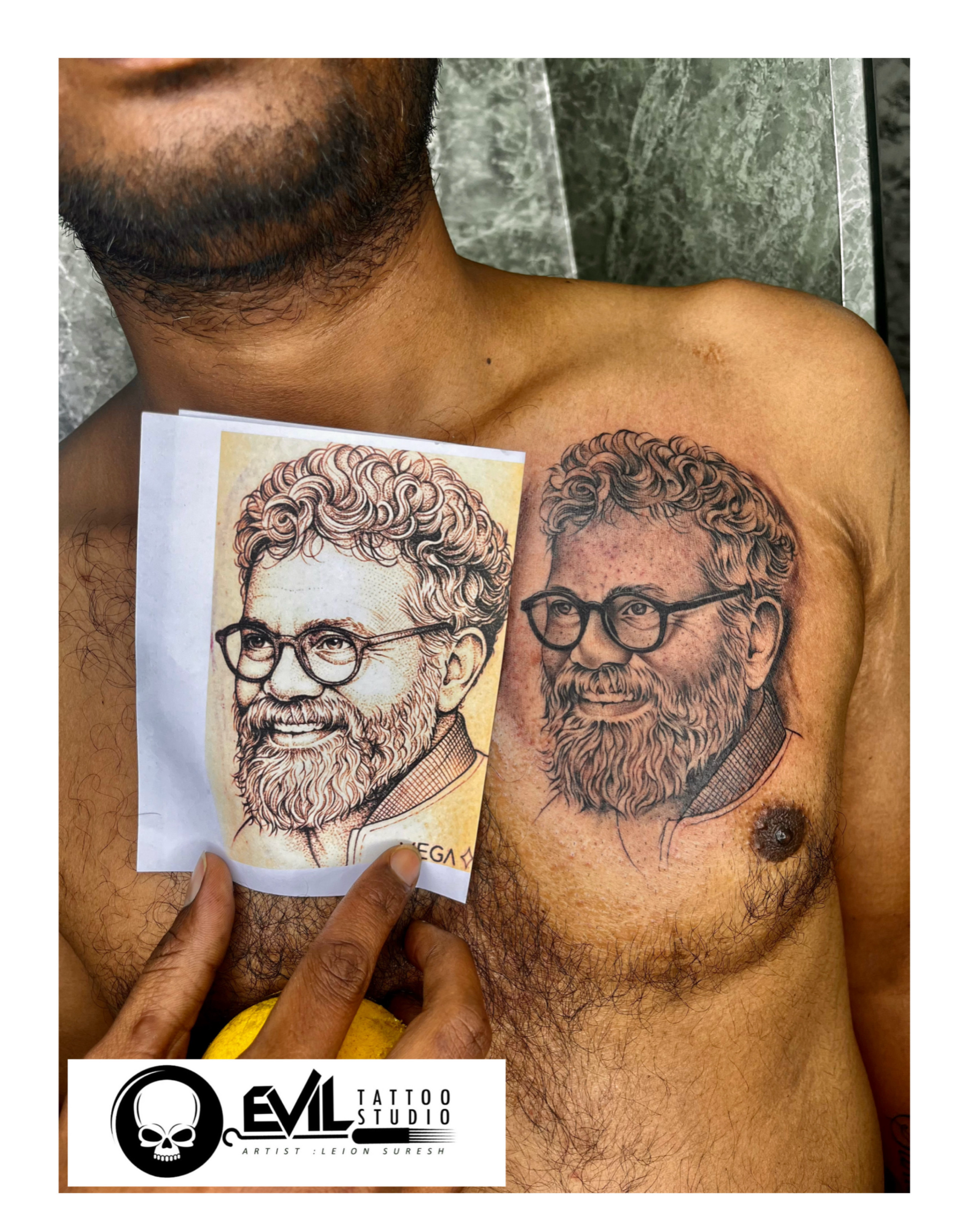 Hyper-realistic portrait tattoo by Evil Tattoo Studio 🔥 Bringing art to life with precision, detail, and passion! This custom portrait tattoo showcases fine linework, smooth shading, and a perfect resemblance to the reference image. 📍 Located in Madhapur, we specialize in realistic tattoos, portrait tattoos, custom designs, and premium ink work. Looking to turn your ideas into timeless body art? Visit Evil Tattoo Studio for the best tattoo experience in Hyderabad. 💬 DM us to book your appointment today! ⸻ #Tags: #EvilTattooStudio #MadhapurTattooStudio #HyderabadTattooArtist #PortraitTattoo #RealisticTattoo #TattooArt #TattooLovers #InkLife #CustomTattoo #TattooStudioIndia #BestTattooStudio #TattooInspiration #BlackAndGreyTattoo #TattooDesign #InkMaster #HyderabadArtists #TattooWork #BodyArt #TattooCulture #TrendingTattoos