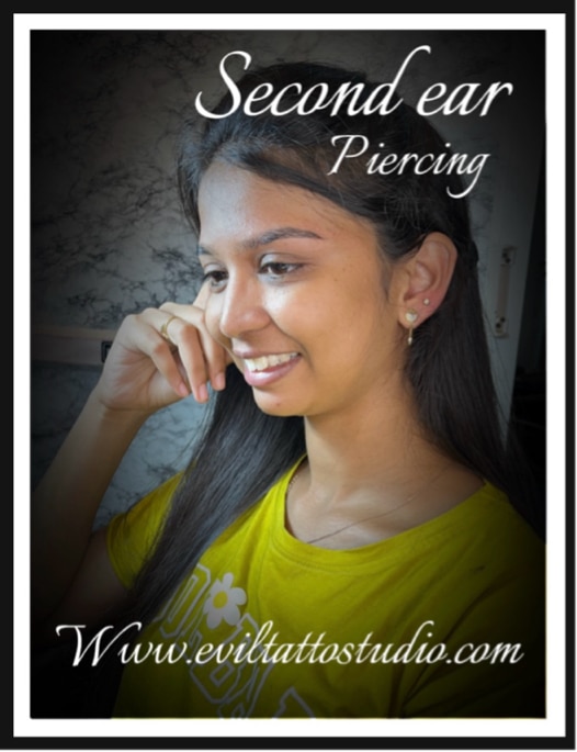 Second ear piercing (an additional piercing above the standard lobe piercing). • Target Audience: Individuals who already have a first ear piercing and want to add another one for style and fashion. • Visuals: Shows a smiling young woman with a second ear piercing, wearing two earrings on the same ear. • Provider: Evil Tattoo Studio (website: www.eviltattostudio.com).